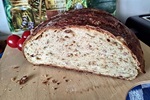 Den Teig auf einer bemehlten Fläche zu einem runden/ovalen Laib formen und auf ein vorbereitetes Backblech geben. Das Brot in den heißen Backofen geben (Mittelschiene) und 50 Min. backen. Anschließend den Klopftest machen und das Brot auf einem Gitter auskühlen lassen.
