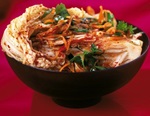 Vom Herd nehmen und anschließend gut abkühlen lassen. Die Chinakohl-Streifen gut auspressen und wieder in die Schüssel geben. Die Marinade darüber gießen, gründlich durchmischen und 4-6 Stunden ziehen lassen.
