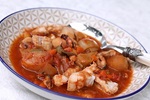 Den Weißwein angießen und die Meeresfrüchte einrühren. Alles mit Salz, Pfeffer, Safran und Chiliflocken würzen. Die Meeresfrüchte zugedeckt unter gelegentlichem Rühren 10 Minuten köcheln lassen.