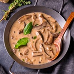 Butter bei mittlerer Hitze in einer beschichteten Pfanne zerlassen und die Zwiebel darin glasig schwitzen. Pilze zugeben und mit anbraten. Mit Mehl bestäuben und unter Rühren kurz mit anschwitzen. Mit Gemüsebrühe und Sahne ablöschen und unter Rühren einmal aufkochen lassen. Hitze reduzieren und die Soße für 10 Minuten leise köcheln lassen. Mit Salz und frisch gemahlenem Pfeffer abschmecken.
