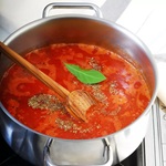 Oregano und Basilikum unterrühren und alles offen bei schwacher Hitze ca. 20 Min. ganz leicht köcheln und damit einkochen lassen. Dabei gelegentlich umrühren.